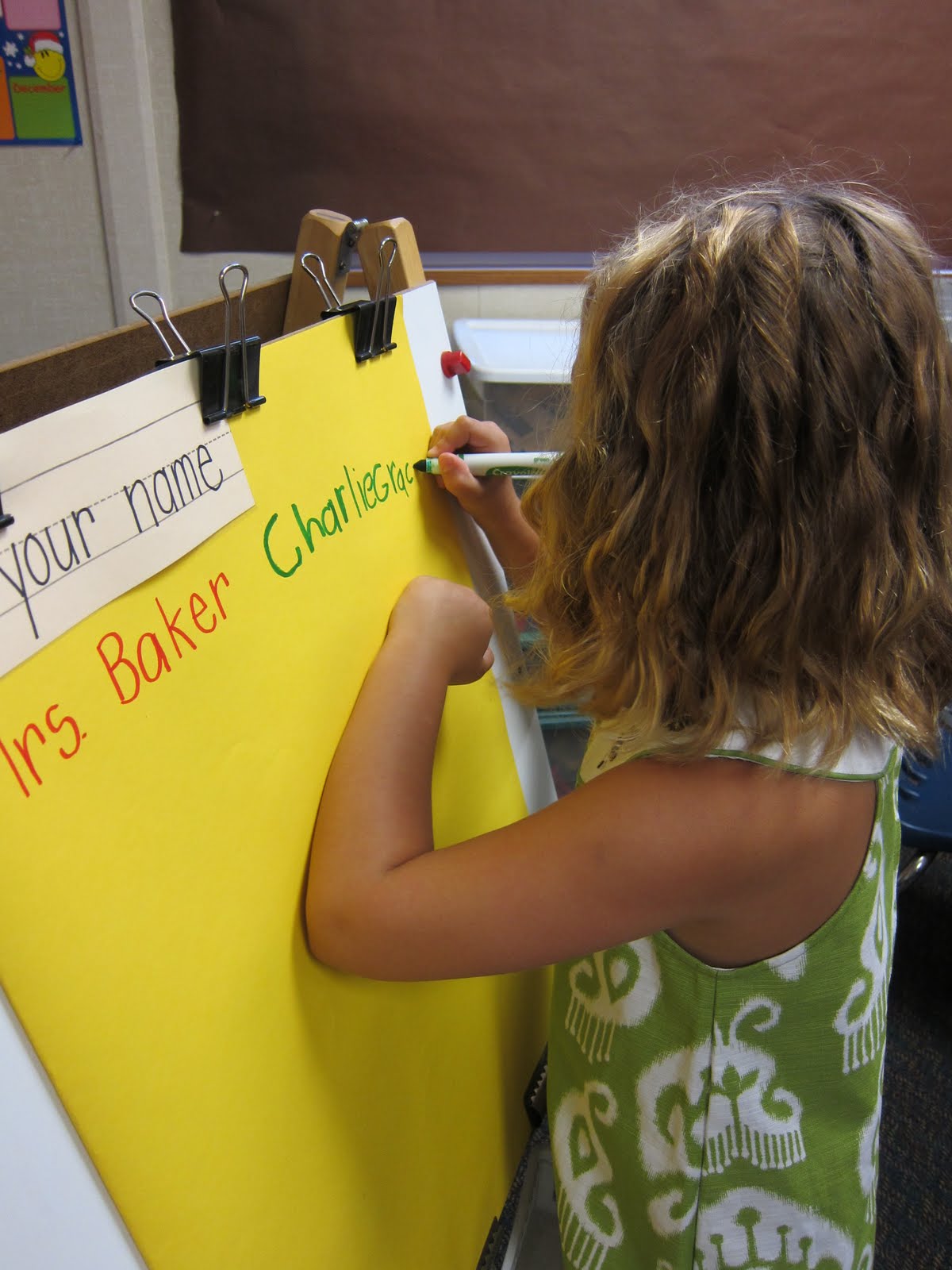 Charlie's first assessment. Each student has to write their name on the poster paper and they will compare from first day of kinder to last day. Charlie got to go first!